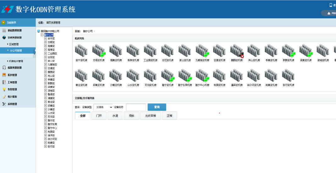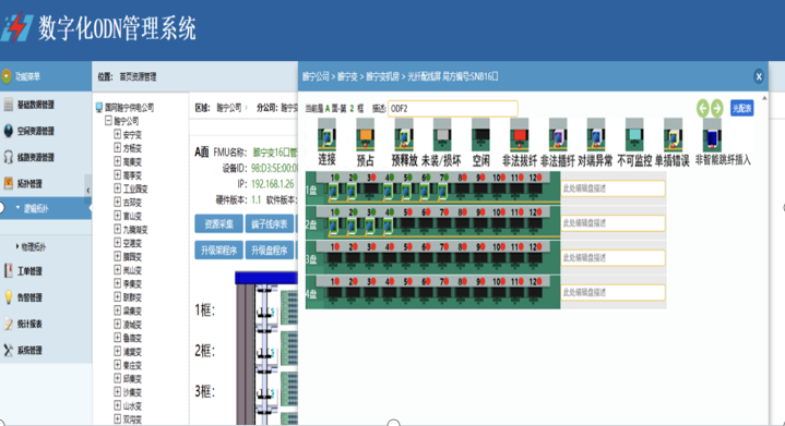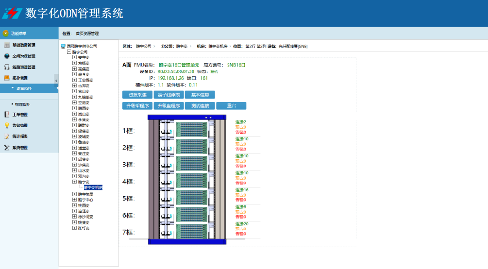 数字化ODN的建设内容为:通信机房(变电站)光纤配线架端口资源管理系统,实现通信机房(变电站)光纤配线架端口状态自动采集, 装维工单联动,端口使用者信息自动收集,最终实现通信机房(变电站)端口可视化管理。系统包括设备管理、工单管理、数据展示、告警提醒等功能。