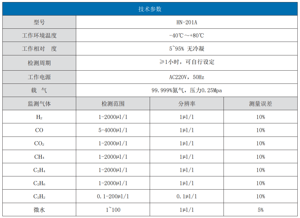 本装置能检出变压器油中 H2、CO、CH4、C2H6、C2H4、C2H2、CO2 ( 也可增加对O2气体的监测 )及微水的浓度测量值;能上传故障及浓度越限等报警信号;可以上传单次组份测量的色谱图形数据;可实现修改采样周期, 报管阀值及启动测量等功能。
